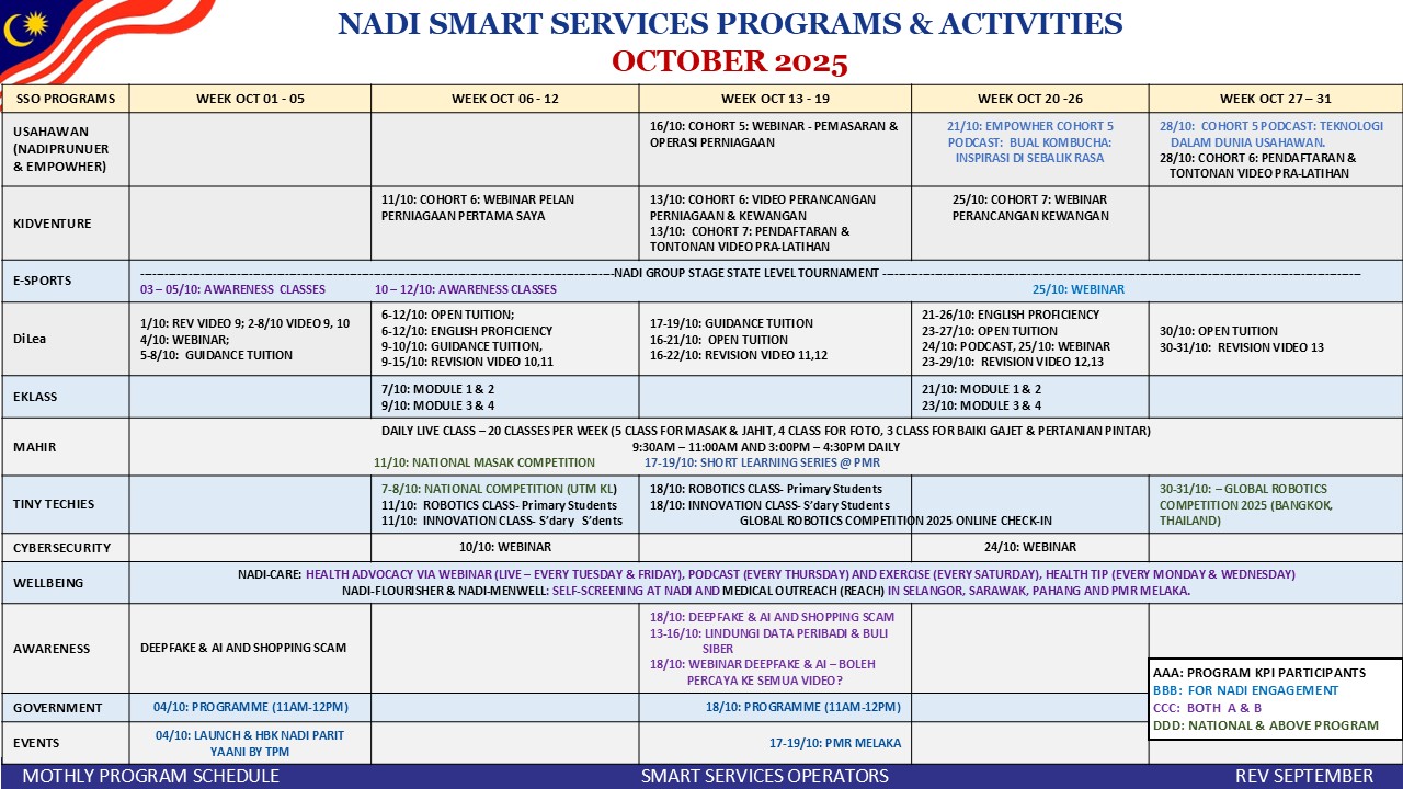Program NADI Webinar, Podcast dan Short Tips Kesejahteraan Kendiri Tarikh / Masa Sepanjang oktober 2025 Tempat NADI Pekan Kapit NADI Pekan Kapit β Sepanjang bulan Oktober 2025, NADI Pekan Kapit turut mengalakkan komuniti di sekitar Kapit untuk mengikuti program dan […]