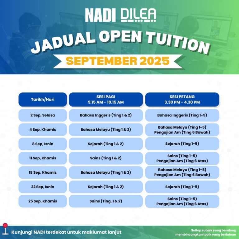 Pembelajaran Sepanjang Hayat Julai 2025 – Jadual Open Live Class Julai 2025 yang terbuka kepada Pelajar Tingkatan 4 dan Tingkatan 5 yang merangkumi subjek teras iaitu BI, BM SJ dan MT. Untuk pendaftaran segera : NADI Pekan Kapit – 011-62789623