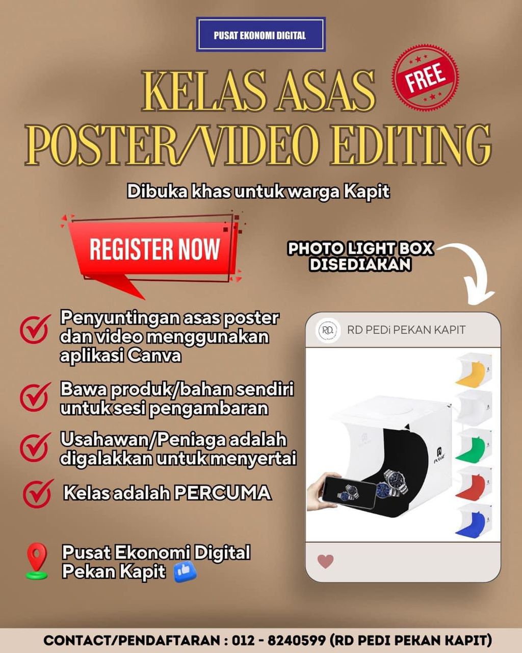 ? Bagi yang berniaga, boleh membawa produk sendiri dan kami ada menyadiakan photo lightbox.