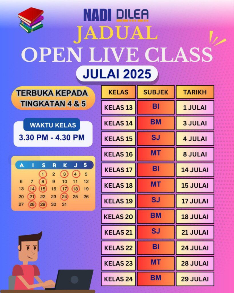 Julai 2025 – Jadual Open Live Class Julai 2025 yang terbuka kepada Pelajar Tingkatan 4 dan Tingkatan 5 yang merangkumi subjek teras iaitu BI, BM SJ dan MT.