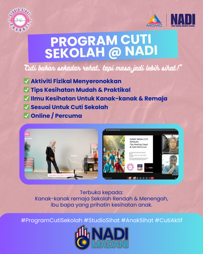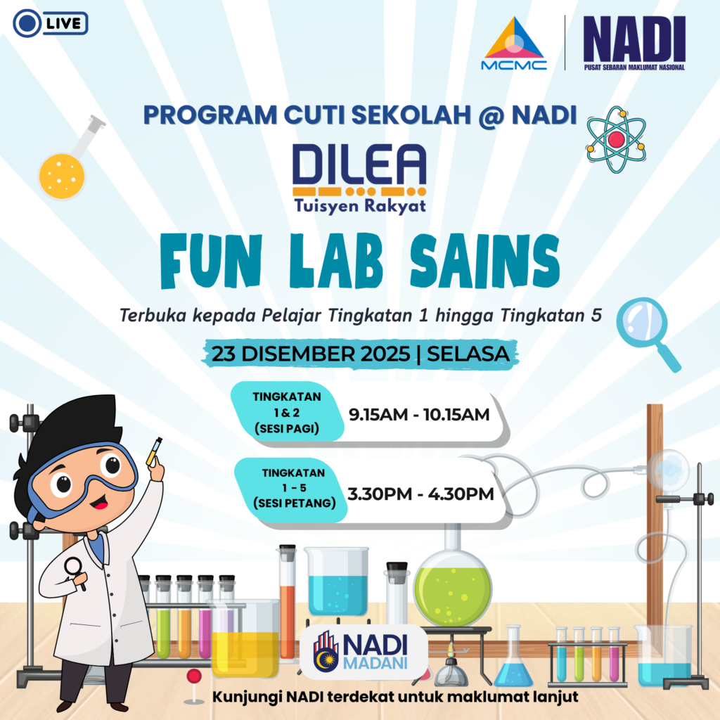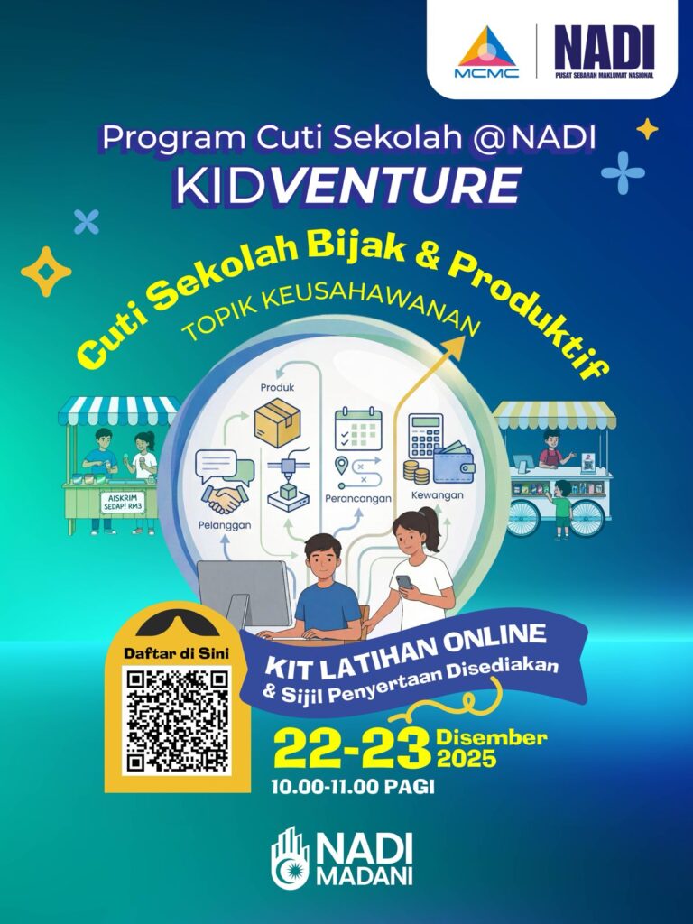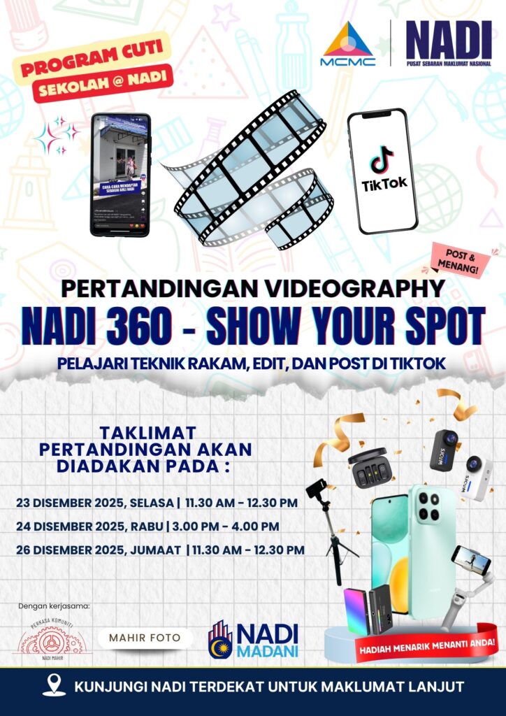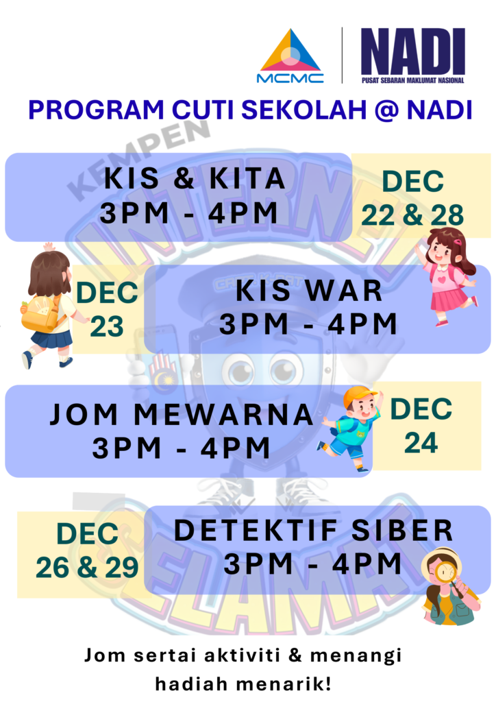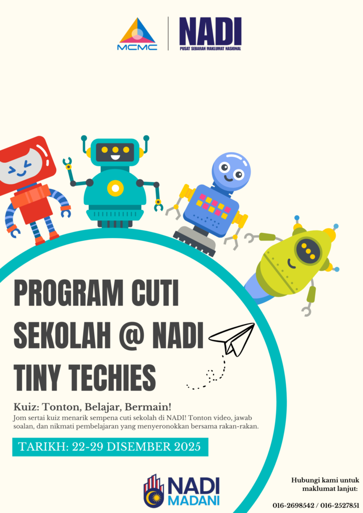 Berkunjung ke NADI dan mari meneroka program cuti sekolah @ NADI bersama program Perkhidmatan Pintar NADI semasa cuti sekolah. Antara aktiviti yang dianjurkan adalah secara atas talian dan bersemuka. Rancakkan masa cuti anak anda dan komuniti di sekitar NADI dengan program cuti sekolah @ NADI. Program Cuti Sekolah @ NADI bermula dari 22 Disember 2025 hingga 30 Disember 2025.